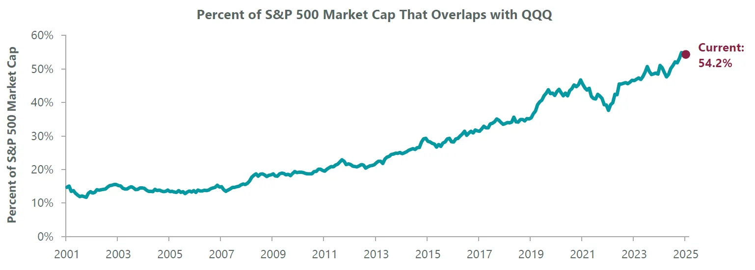 With the S&P 500 achieving new all-time highs in late January and the potential for further upside on the horizon, the power of diversification remains underappreciated in our view. Following the tremendous run growth stocks have had over the past few years, we believe many investors are under-diversified. Over the past two decades, the composition of the S&P 500 has increasingly mirrored the more growth- and technology-oriented NASDAQ tracker QQQ, meaning many “core” allocations now embed a large share of growth within them. As a result, many investors may be inadvertently overexposed to these areas, resulting in portfolio concentration challenges.