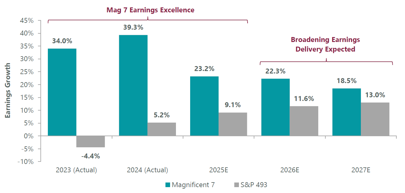 The most remarkable factor driving markets over the last several years has been the resiliency of economic growth. AI investment, which today is responsible for approximately one-third of all capital investment, as well as continued spending by the U.S. consumer, have sustained S&P 500 profits, which will likely grow again at double-digit rates in 2026. Front-loaded fiscal stimulus from the One Big Beautiful Bill is estimated to add 50-100 basis points to GDP next year and, while there is stimulus for both consumers and corporates from the bill, businesses will be able to immediately deduct capital expenses such as investments in equipment and R&D. This is expected to bolster overall capital spending, which should broaden and remain strong even if AI capex spending moderates in 2027 and beyond.