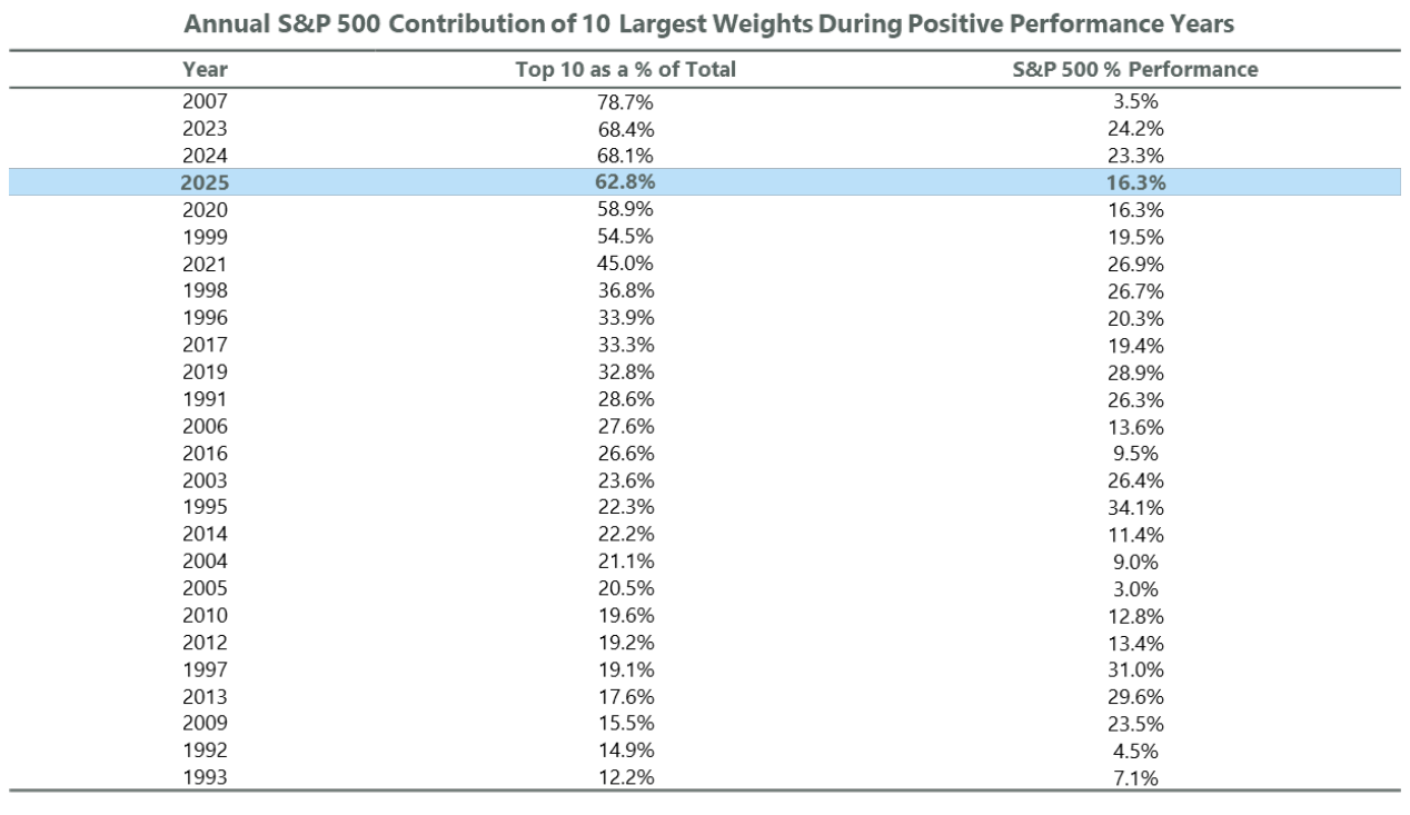 Finally, we have some concerns over the disproportionate role AI is playing in driving overall market returns and its resulting effect on market index concentration (Exhibit 2). From both our studies of historical market bubbles, as well as from our own experience as investors over the last 30 plus years, we see some unhealthy parallels with prior periods. These include extreme valuations, circular financing arrangements, a surge in retail participation and increased speculation, particularly through leveraged ETFs and single-day options.